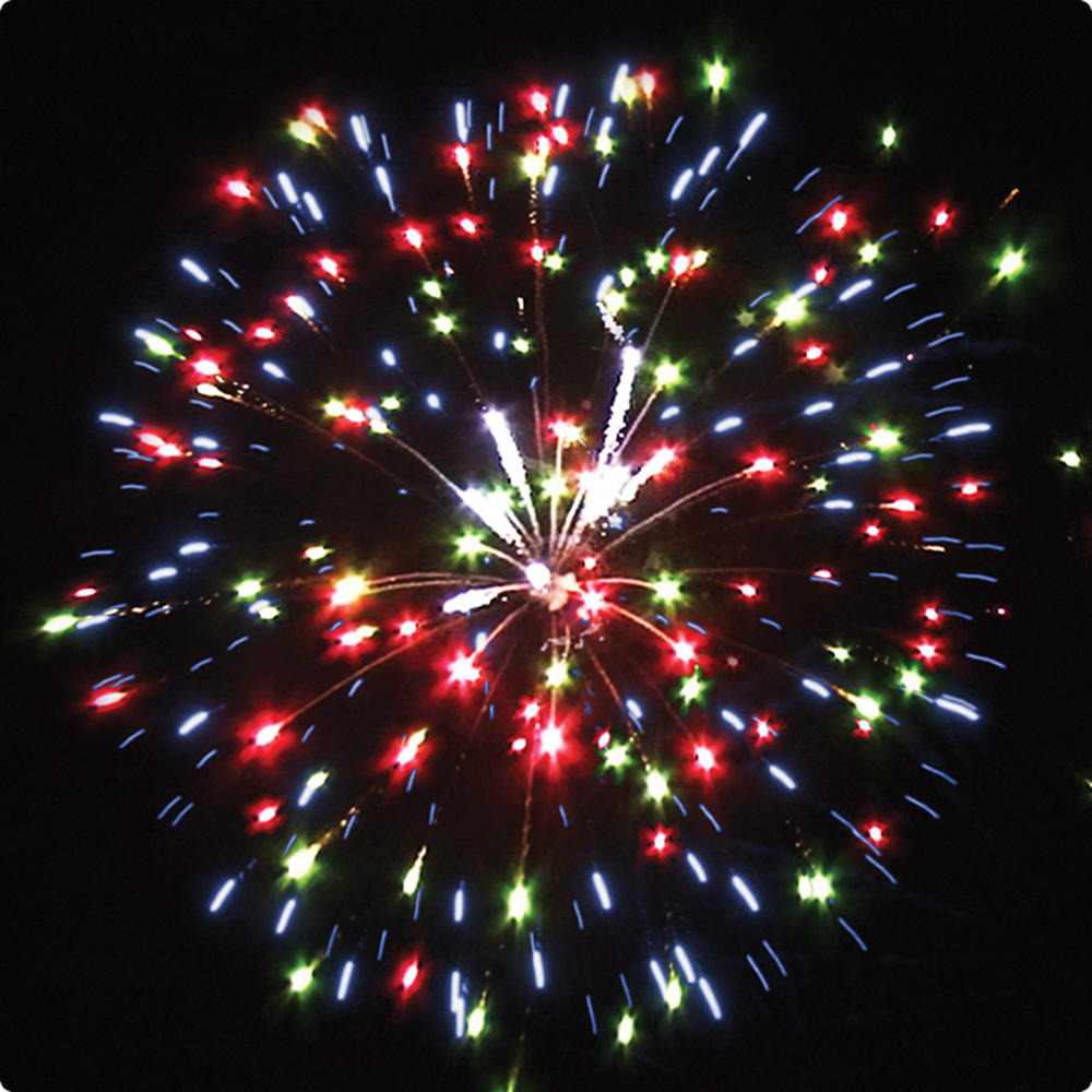 Модульная батарея салютов, 58 зарядов калибром 1 дюйм (более 25 мм.) 7 эффектов: Разноцветные кометы разрываются сферами из: