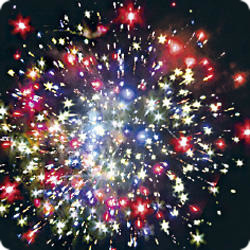 Модульная батарея салютов, 36 зарядов калибром 1.25 дюйма (около 32 мм.) 4 эффекта: подряд 1. Красные звезды с пышными хвостами (кокос) и белое мерцание 2. Множество серебряных ниспадающих нитей (парча) и зеленое мерцание 3. Зеленые звезды с пышными хвостами (кокос) и золотое мерцание 4. Оранжевые звезды с пышными хвостами (кокос) и облако треска (трещащая хризантема) (до 55 сек., до 55 м.)