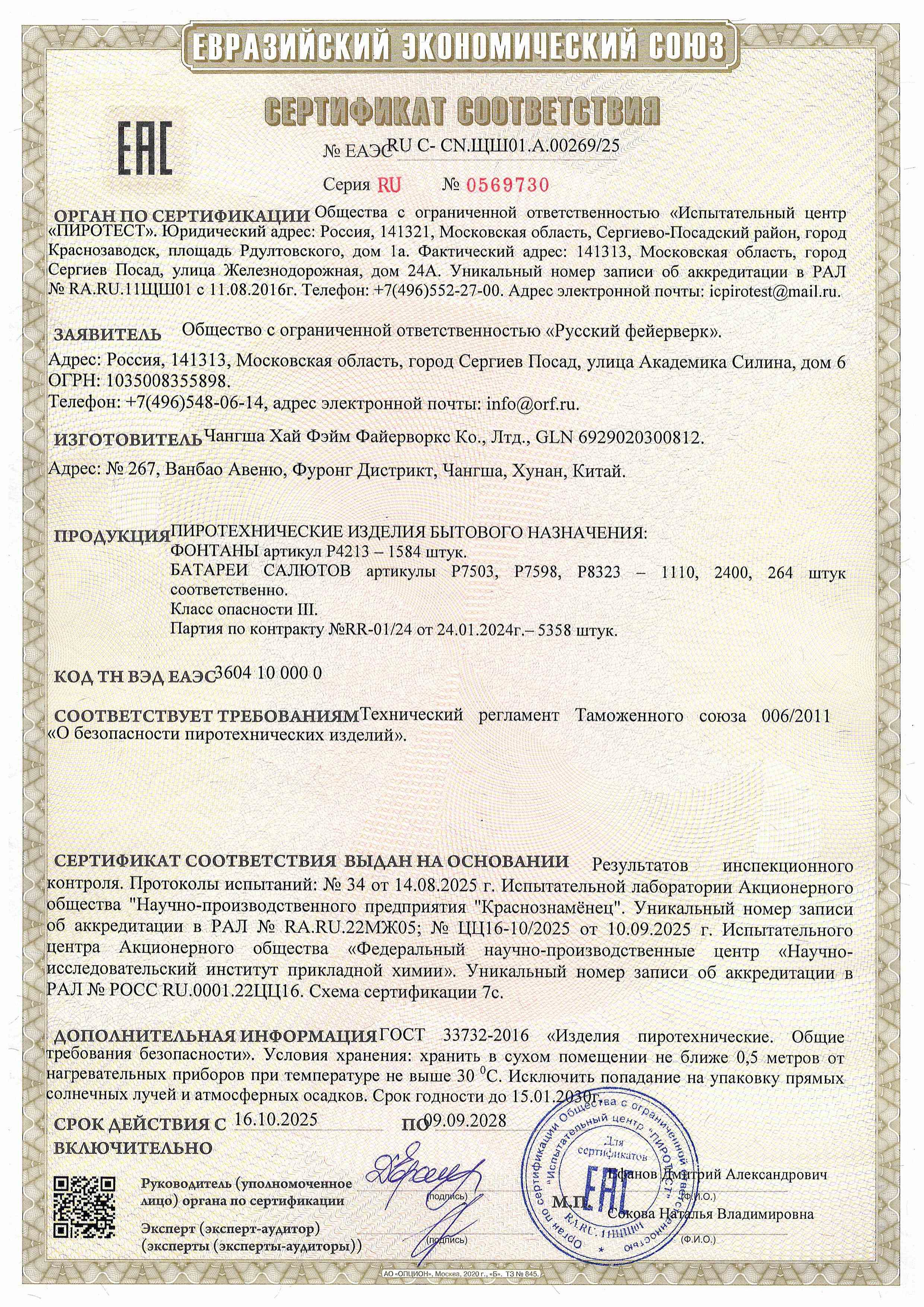 Комбинированная батарея фейерверков 158 зарядов калибром 0,8 дюйма (более 20 мм), 1,2 дюйма (более 30 мм) и 2 дюйма (более 50 мм). 17 эффектов. Красные звезды с белыми хвостами и белое мерцание. Зеленые звезды с белыми хвостами и трещащие звезды. Белые хвосты и красное мерцание. Вверху: Веер из лимонных и малиновых звезд. Внизу: Трещащие звезды. Красные, зеленые или фиолетовые звезды и белое мерцание. Серебряная ромашка с центром из синих огней. Вверху: Веер из белых хвостов и трещащих звезд. Внизу: Трещащие звезды. Золотые мерцающие хвосты. Лимонные мерцающие звезды с золотыми хвостами. Угольные хвосты, синие звезды и красное мерцание. Шуршащая змейка, синие звезды и облако трещащих разрывов. Серебряная ромашка с центром из красных мерцающих огней. Веер из золотых комет, в центре - красное мерцание, зеленые и малиновые звезды с шуршащими ёжиками. Белые кометы с пышным шлейфом. Залп разрывается золотыми шуршащими хвостами. (110-130 сек., до 75 м)