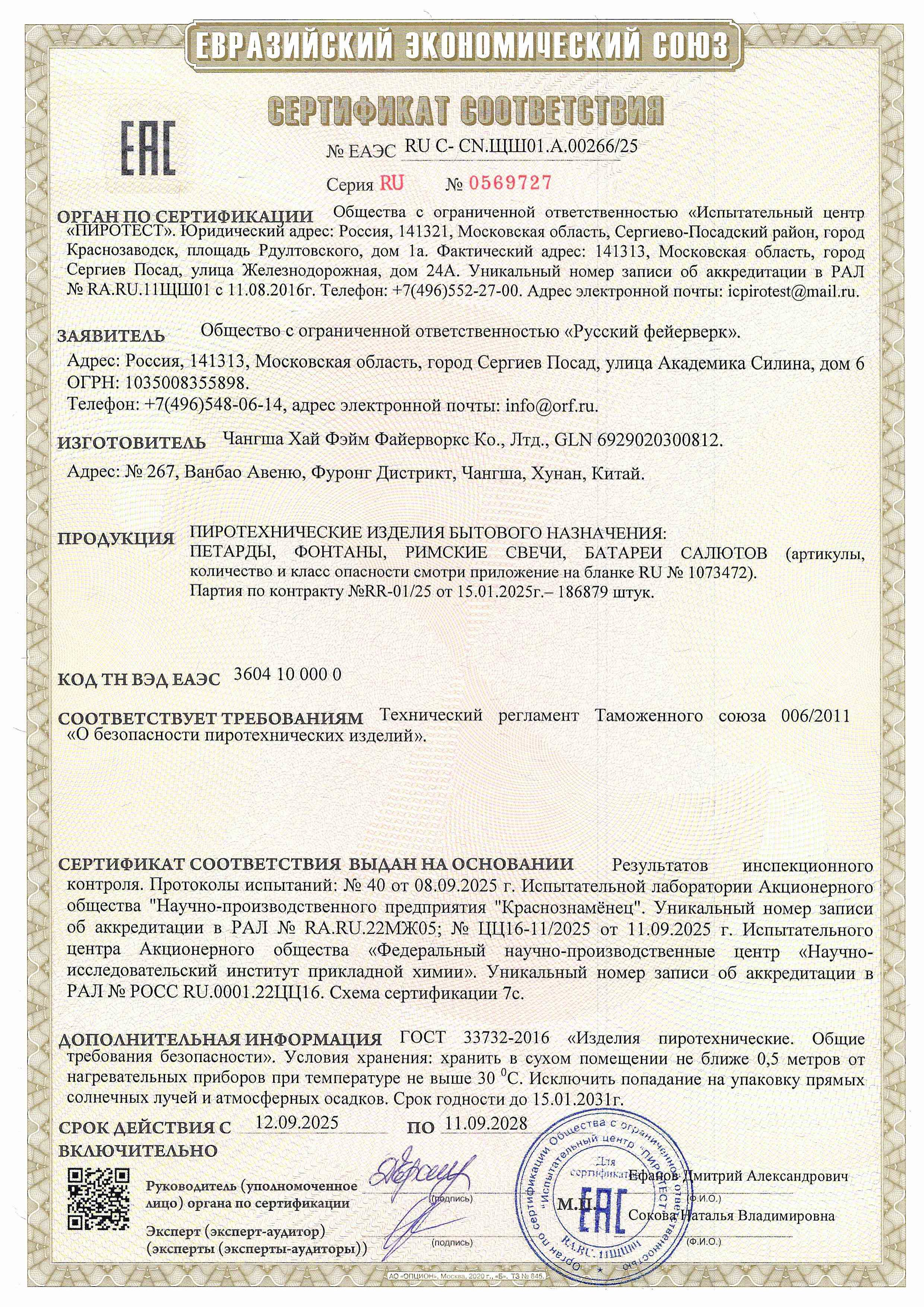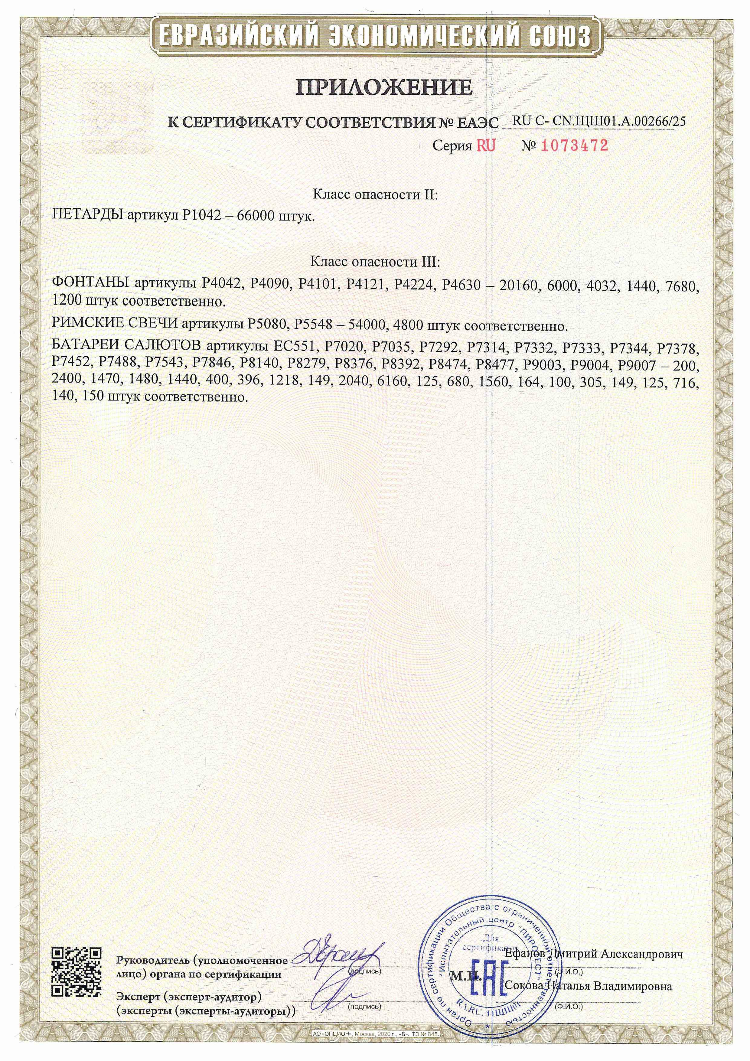 Веерная, крупнокалиберная, комбинированная, многоуровневая батарея салютов, 314 зарядов калибром 0.8; 1 и 1.25 дюйма (более 20, 25 и около 32 мм.) 20 эффектов: 1- 2. Выстреливает подряд: Трещащие золотые хвосты (трещащая ива) и красное мерцание. Трещащие золотые хвосты (трещащая ива) и зеленое мерцание. 3. Белые звезды с хвостами (волна) и красное мерцание. 4. Белые звезды с хвостами (волна) и множество золотых ниспадающих нитей (парча). 5. Белые звезды с хвостами (волна) и золотой треск. 6. 2 уровня. Веер: внизу - треск, вверху - золотые букеты (лошадиные хвосты) и красно-зеленые букеты (падающие листья). 7- 10. Выстреливает подряд: Свист. Серебряная вертушка. Красные звезды с пышными хвостами (кокос) и облако треска (трещащая хризантема). Зеленые звезды с пышными хвостами (кокос) и облако треска (трещащая хризантема). 11. Синие звезды с пышными хвостами (кокос) и красное мерцание. 12. Синие звезды с пышными хвостами (кокос) и золотое мерцание. 13. Синие звезды с пышными хвостами (кокос) и облако треска (трещащий дождь). 14. Веер W - формы: по сторонам - кометы с трещащими хвостами, в центре - множество серебряных ниспадающих нитей (парча) и сине-зелено-красные звезды. 15. Веер W - формы: по сторонам - золотые ниспадающие нити (лошадиные хвосты), в центре - сфера золотых хвостов с переходом в белые звезды (цветная хризантема). 16. Веер W - формы: по сторонам - золотые ниспадающие нити (лошадиные хвосты), в центре - сфера золотых хвостов с переходом в красные мерцающие звезды (цветная хризантема). 17. Веер W - формы: по сторонам - золотые ниспадающие нити (лошадиные хвосты), в центре - сфера золотых хвостов с переходом в красные, синие и зеленые звезды (цветная хризантема). 18. Веер W - формы: по сторонам - трещащие кометы, в центре - сфера золотых хвостов с переходом в красные, синие и зеленые звезды (цветная хризантема). 19. ЗАЛП: множество золотых ниспадающих нитей (парча) и красное мерцание. 20. ЗАЛП: множество золотых ниспадающих нитей (парча) и облако треска (трещащий дождь). (до 180 сек., до 55 м.)