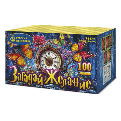 Батарея салютов, 100 зарядов калибром 1.25 дюйма (около 32 мм.) 5 эффектов: 1. Множество золотых ниспадающих нитей и облако золотого треска; 2. Красные звезды с пышными хвостами и облако золотого треска; 3. Множество серебряных ниспадающих нитей и облако золотого треска; 4. Фиолетовые звезды с пышными хвостами, множество золотых ниспадающих нитей и облако золотого треска; 5. Зеленые звезды с пышными хвостами, множество золотых ниспадающих нитей и облако золотого треска. (до 60 сек., до 55 м.)